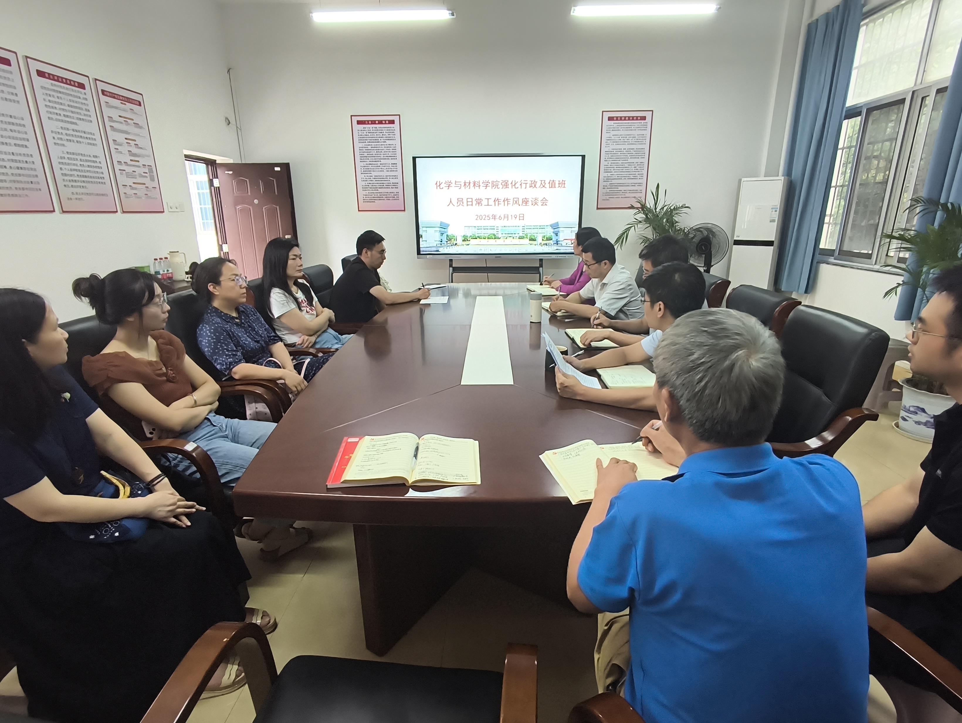 为推进深入贯彻中央八项规定精神学习教育见行见效,2025年6月19日11:00,学院召开强化行政及值班人员日常工作作风座谈会。学院党政全体领导,全体坐班制人员参会,会议由学院党委书记刘庆言主持。